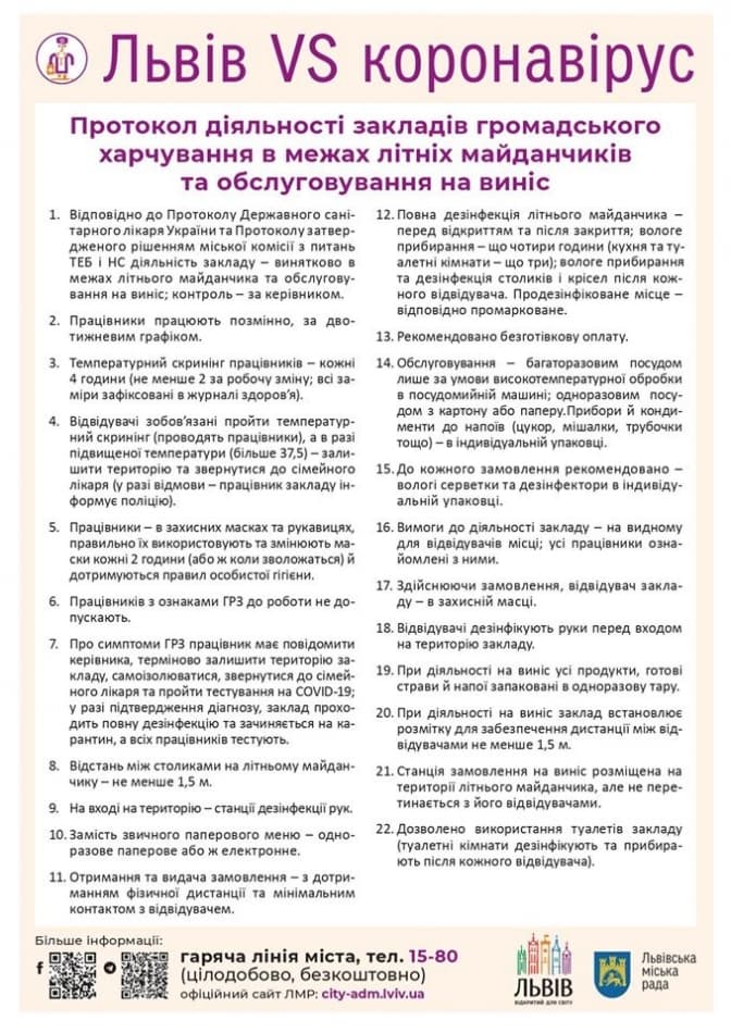 Перед відкриттям та після закриття мають проводити повну дезінфекцію закладу. І кожних 4 години – вологе прибирання літнього майданчику. Після кожного відвідувача його місце мають продезінфікувати та промаркувати таблицею чи наліпкою. Мерія рекомендує застосовувати безготівкову оплату. Кухня повинна проходити вологе прибирання та дезінфекцію кожних 3 години.