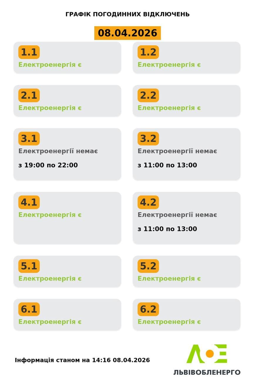 Львівобленерго опублікувало оновлені графіки відключень світла на середу, 8 квітня.