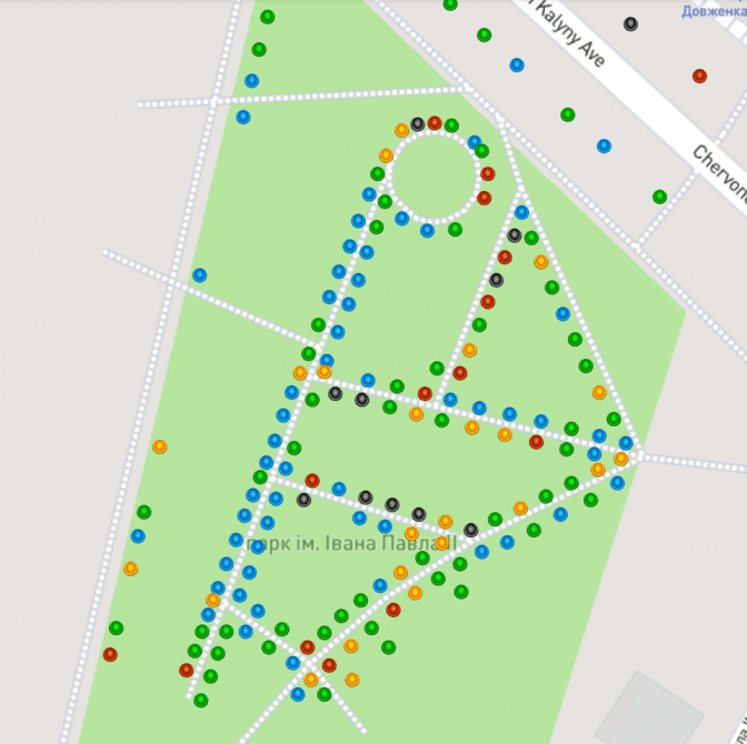 На карті голубим позначені дерева в ідеальному стані, зеленим - доброго стану, жовтим - задовільного, червоним - незадовільного і чорним – мертві дерева (карта Inspectree)