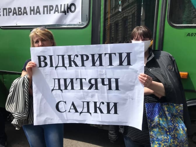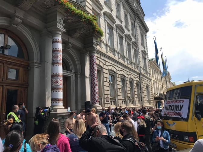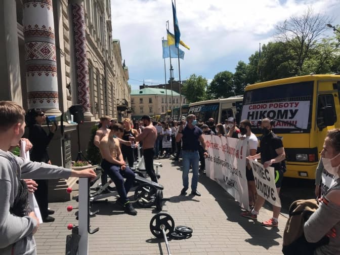 Від ранку тут почали акцію протесту з вимогою відновити міжміські перевезення перевізники Львівської області. Зараз до них приєднались тренери фітнес-клубів та вихователі дитсадків, які також вимагають дозволити їм працювати. Спортсмени розпочали тренування просто біля входу в ЛОДА.
