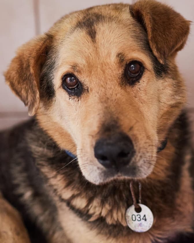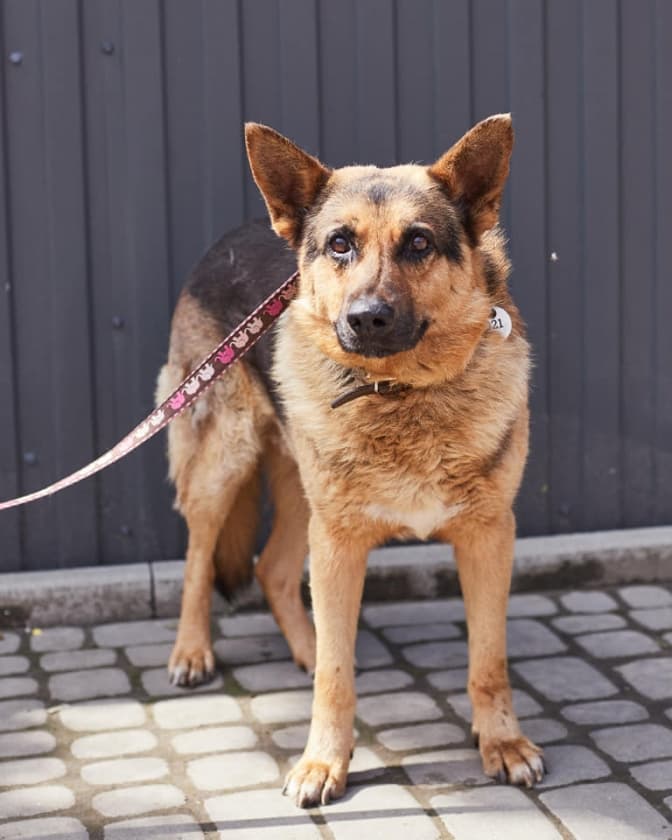 Верона, 4 роки. Дуже зворушлива собака. Не довіряє, не охоче йде на контакт, а від неї усе одно віє якоюсь любов'ю і теплом. Із нею працюватимуть кінологи.