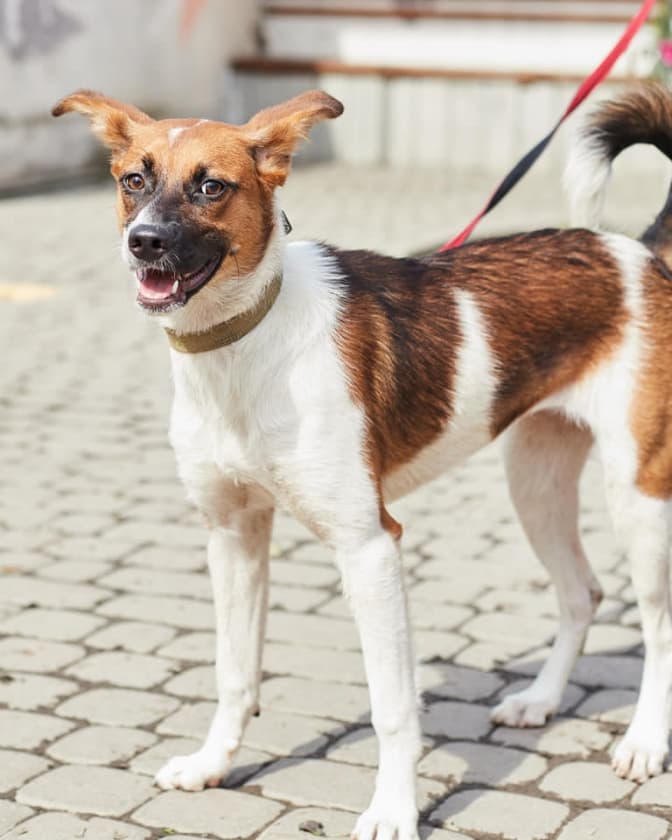 Ріна, 1 рік. Ця вухата малявка мала на собі ошийник, тож, можливо, її шукають. Гавкуча, бадьора. Постійно весела, бо думає, що потрапила у собачий пансіонат, де усі друзі.