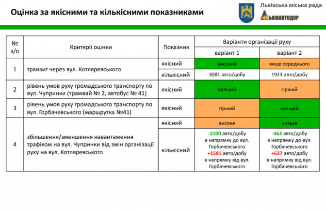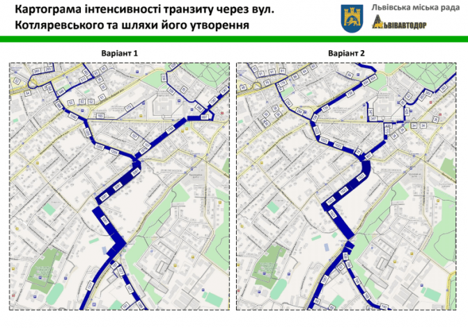 (Варіант 1 – рух транспорту на вул. Котляревського до вул. Горбачевського, Варіант 2 – рух транспорту на вул. Котляревського здійснюється від вул. Горбачевського)