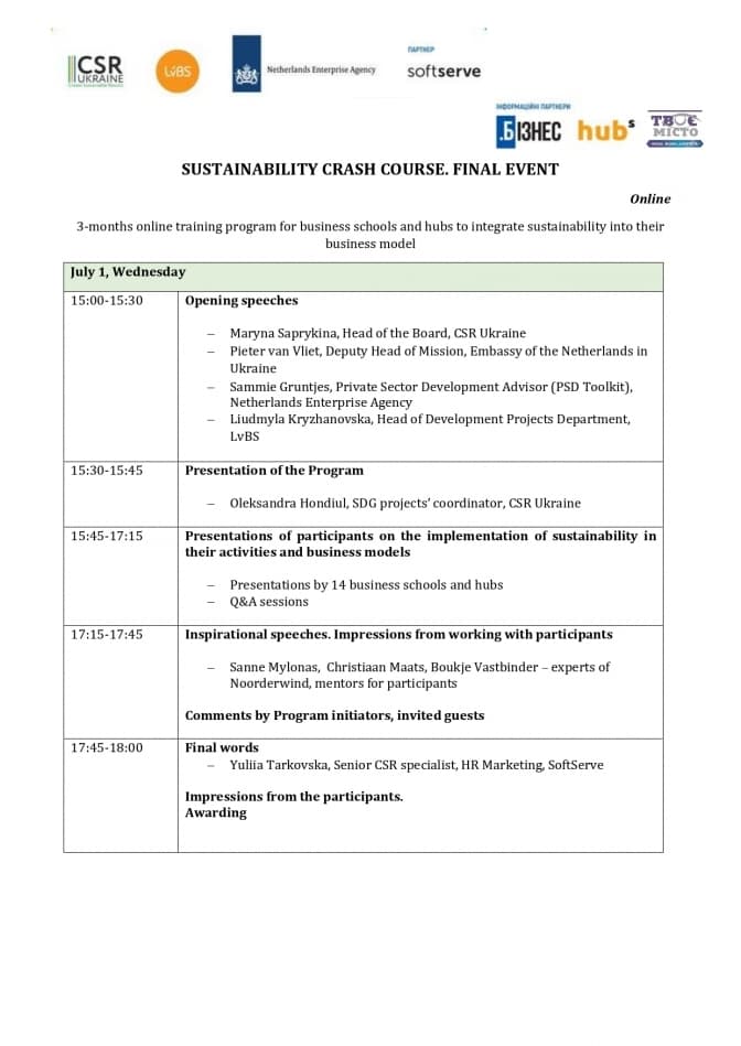 1 липня 2020 року бізнес-школи та хаби презентуватимуть результати впровадження сталого розвитку у свої бізнес-моделі. Долучитися до неї можна буде в Zoom за посиланням.