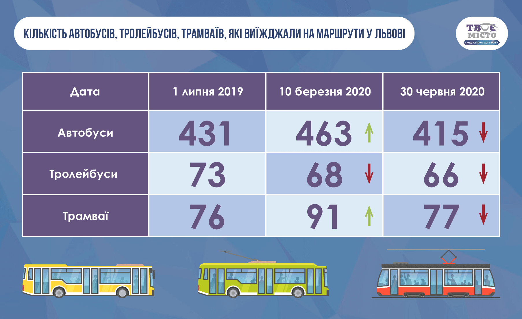 Виявилося, що кількість автобусів усіх видів на міських маршрутах 30 червня була меншою, ніж 10 березня 2020 року і навіть 1 липня минулого. Кількість тролейбусів незначно менша, ніж 10 березня і значно менша ніж рік тому, а трамваїв майже на рівні річної давнини.