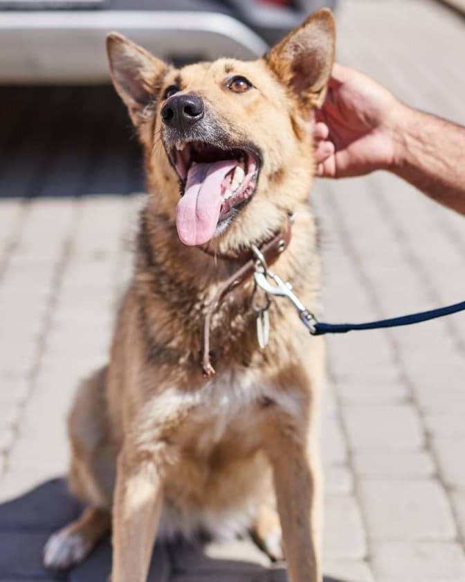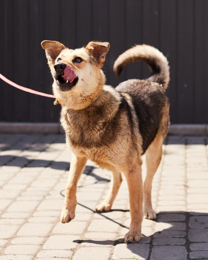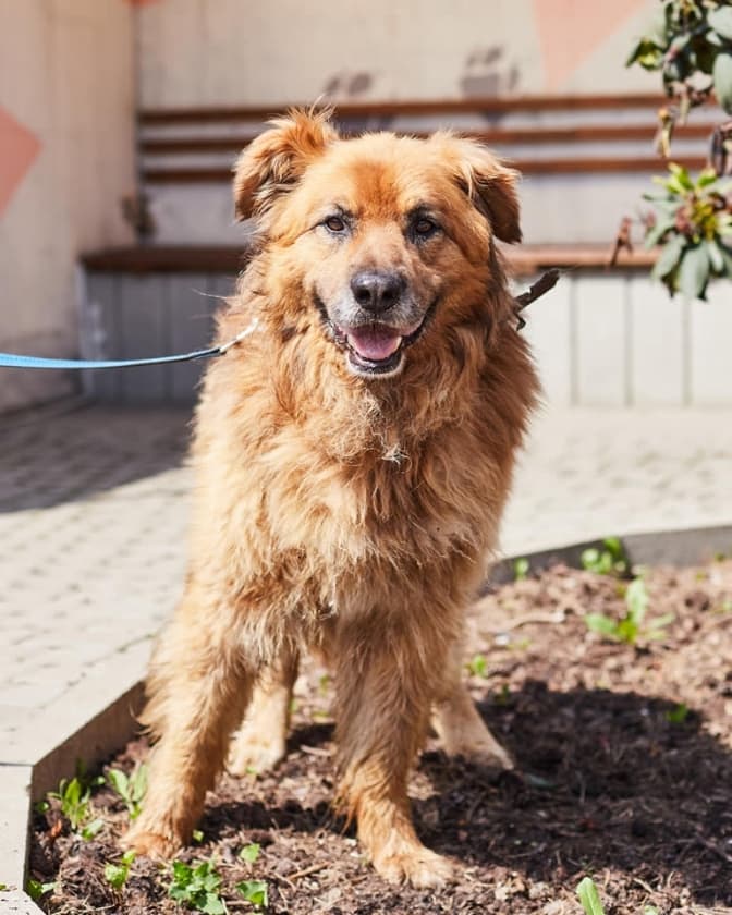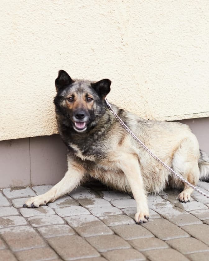 БЕНДЕР, 10 років. Місце відлову: вул. Повітряна. Теж мав на собі ошийник, і за всіма ознаками мав господаря. Гуляє на повідку, туалетні справи робить на вулиці, акуратно їсть і облизує людям руки. Швидше за все, жив на дивані і одного дня загубився.