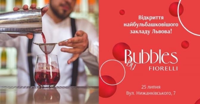 Цієї суботи, 25 липня, у центрі Львова відбудеться вечірка-відкриття Bubbles Bar by Fiorelli. Це унікальний заклад із італійським ігристим на вулиці Нижанківського. Найбульбашковий бар із найкращими напоями від Fiorelli запрошує львів’ян та гостей міста на шалені танці та найсмачніші ігристі. Вечірка розпочнеться о 19:00. Вхід вільний.