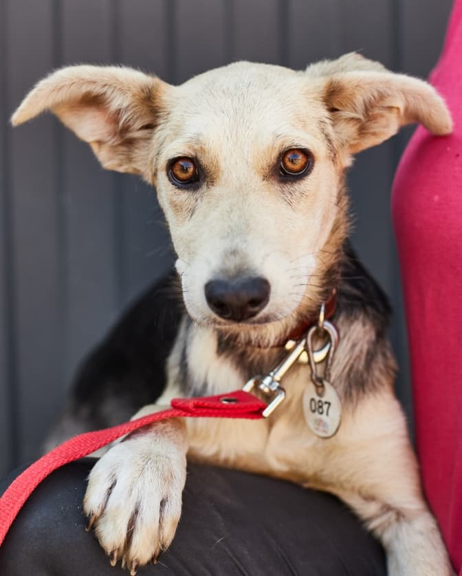 Лола, 1 рік. Сестра Тайри, що на першому фото. Їй страшно і попереду довгий шлях, але її кінчик хвоста вже радісно тріпоче, коли до неї говорять.