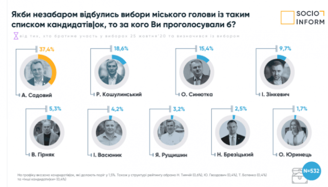 Якби вибори голови Львівської громади відбулися незабаром, то 37,4% опитаних львів'ян, які визначилися з вибором, обрали б чинного мера Андрія Садового, 18,6% проголосували б за Руслана Кошулинського та 15,4% віддали б свій голос за Олега Синютку. Такі результати соціологічного дослідження оприлюднила 21 серпня компанія Соціоінформ на замовлення Львівської мануфактури новин.