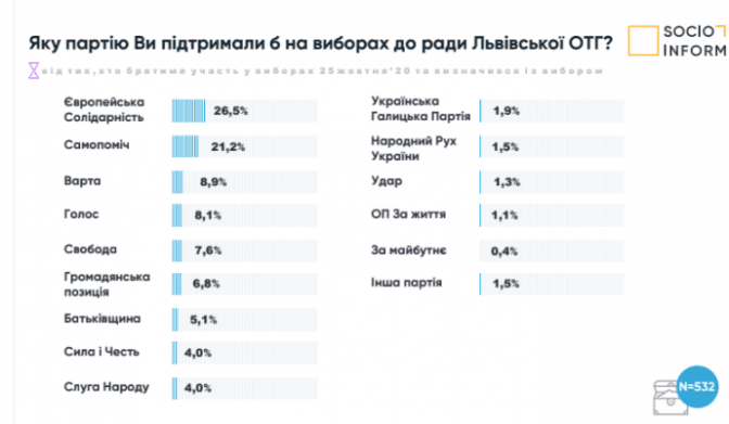 Якщо говорити про підтримку партій на виборах до ради Львівської ОТГ, то бар'єр у 5% долають 7 партій. Більшість опитаних 26,5% проголосували б за Європейську Солідарність, 21,2% за Самопоміч, 8,9% підтримки отримала б нещодавно створена Варта, 8,1% – партія Голос, 7,6% – Свобода, 6,8% – Громадянська позиція і Батьківщина – 5,1%.