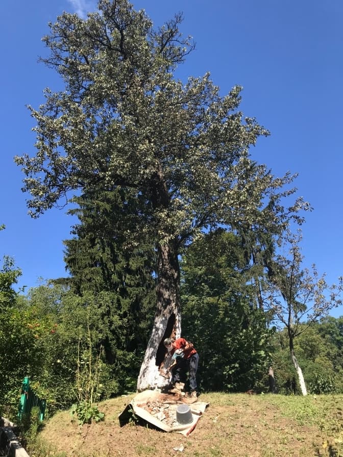 «Це велика терапевтична процедура. Перший етап – очистка, після цього потрібно заповнити порожнини сучасними матеріалами, які будуть її лікувати, а вже тільки потім запломбувати заново. Також має бути обрізка, щоби зменшити навантаження на крони і стовбур. Так само треба демонтувати старі розтяжки й обручі та зробити нові. Разом з цим потрібно вилікувати хвороби, характерні для плодових дерев, як наприклад ураження шкідниками», – каже Богдан Тихолоз.