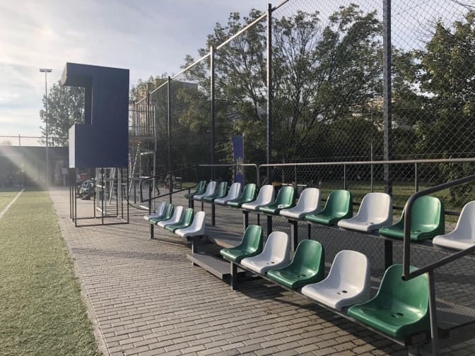 На полі також є коментаторська та спортивне табло. Роздягальні поруч обладнані душовими, бактерицидними рециркуляторами, які дезінфікують повітря, а при вході до приміщення спеціальний пристрій безконтактно, тільки зчитуючи ваше обличчя, вимірює температуру та веде облік усіх, хто заходив. Це спрощує роботу адміністратору майданчика, який тут стежить за розкладом тренувань, адмініструє будівлю та реманент.