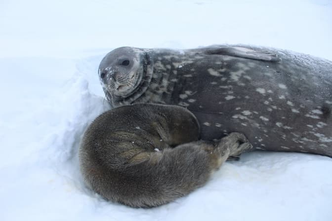 «Це дівчинка, яка поки налякана та тримається матері. Нагадуємо, що вагітність у самок тюленів Уедделла триває 10 місяців. Народження малят відбувається прямо на льоду. Кожна самка приносить по одному малюкові. Новонароджені тюленята зазвичай важать 25-30 кг, а в довжину – до 1,3 м, а коли стануть дорослими, мають важити біля 400 кг», – розповіли у науковому центрі.