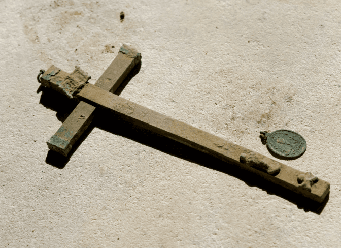 Археологи також натрапили на шовкові шпалери, хрест та кілька медальйонів. Один з них на аверсі має зображення Євхаристії, а на звороті – образ Непорочного зачаття Діви Марії, і був привезений з паломництва до Риму, про що свідчить відповідний напис.