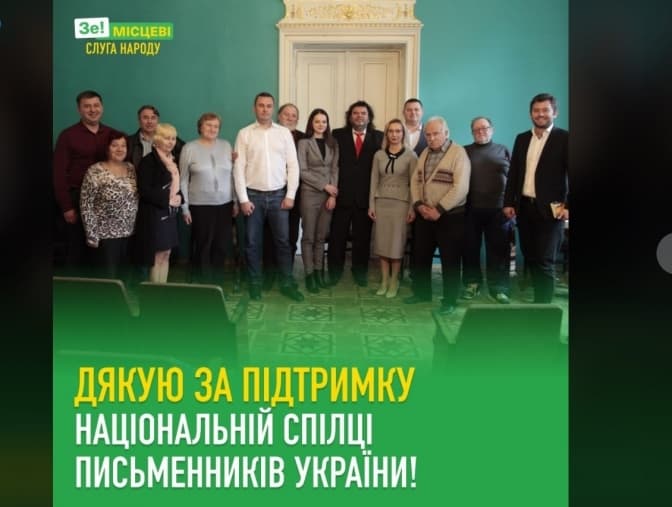 Також в інтернеті оприлюднили світлину, на якій кілька львівських письменників на чолі з головою Львівської обласної організації НСПУ Ігорем Гургулою і кілька осіб позують у «зеленому обрамленні» під характерною передвиборчою «вивіскою» «Зе! Місцеві. Слуга народу». Світлину зробили у приміщенні Львівської обласної письменницької організації та підписали: «Дякую за підтримку Національній спілці письменників України!».