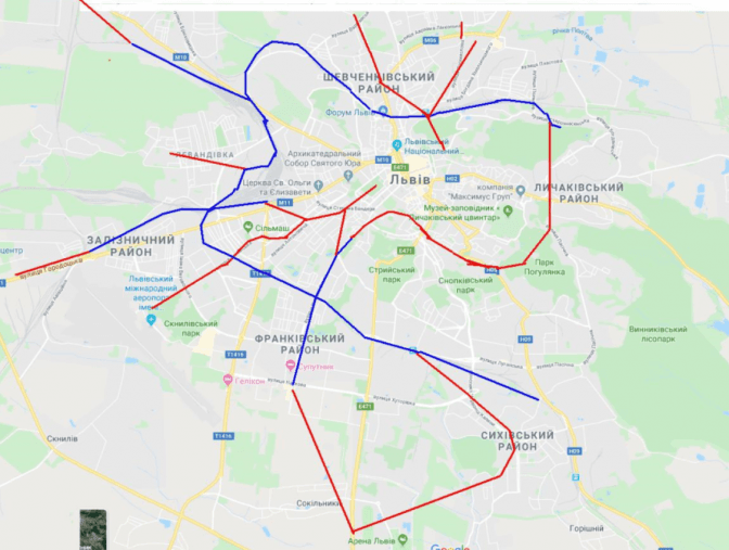 «Червоні лінії, які я позначив, – це те, що передбачає тунель. Розумію, що там є і такі варінти, які неможливо буде реалізувати, але на перехресті Вітовського і Сахарова можна піти під землю і через Стрийський парк зробити тунель до Личаківської і вже там зробити пересадку на залізничну колію», – додає Лозовий.