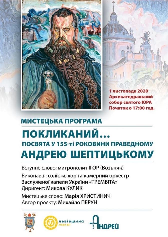 Завтра, 1 листопада, в Архикатедральному Соборі святого Юра, що на пл. Св. Юра, 5 у Львові, відбудеться мистецька програма «Покликаний… посвята у 155-ті роковини Праведному Андрею Шептицькому», повідомляє Львівська Архиєпархія УГКЦ. Початок о 17.00.
