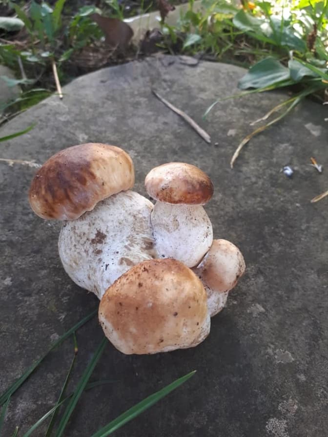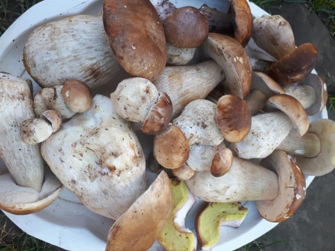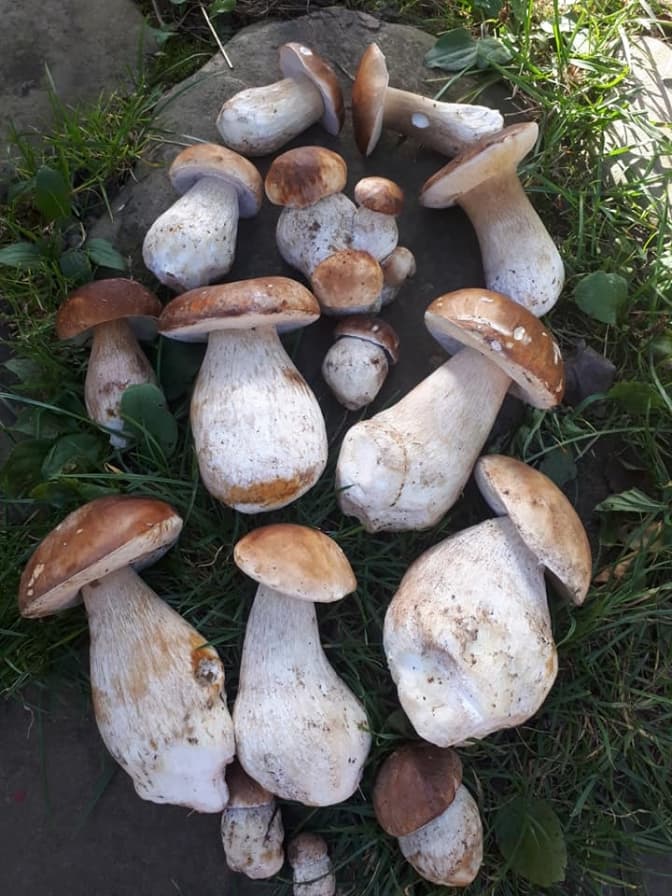 Білі гриби, каже жінка, у них ще називають буковими, а боровики ростуть у смерековому лісі. Вона поділилася фото грибів, які нещодавно зібрав у лісі її батько.
