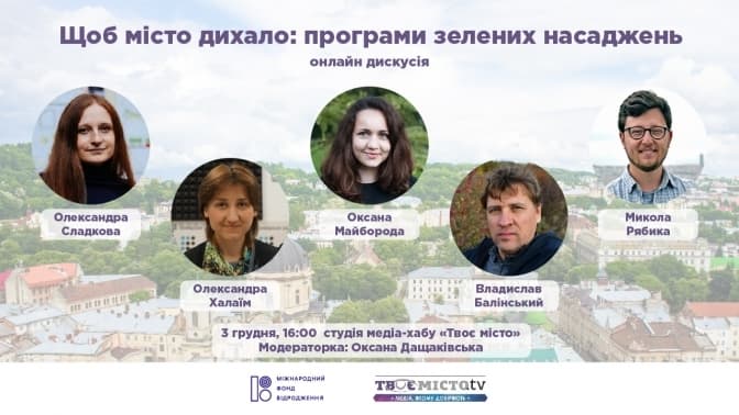 У четвер, 3 грудня, о 16:00 год медіа-хаб «Твоє місто» транслюватиме дискусію про зелені насадження у Львові та про роль у цьому бізнесу. Своє бачення озвучать як представники влади, так і громадського сектору.