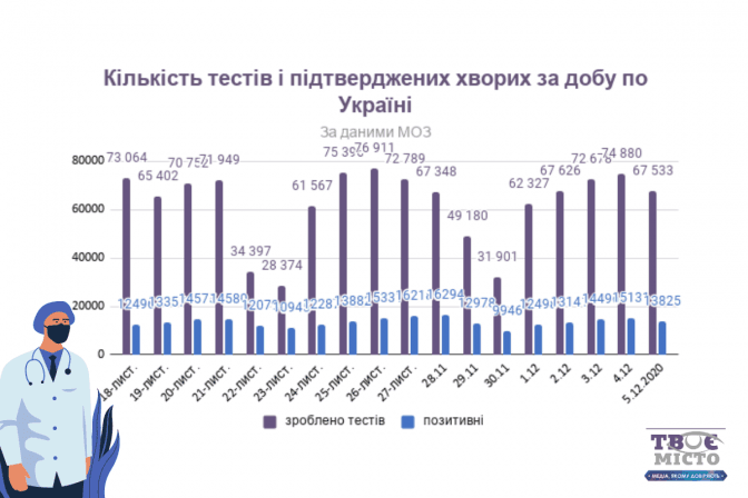 В Україні станом на 5 грудня зафіксували 13 825 нових випадки коронавірусної хвороби Covid-19. Зокрема, захворіли 713 дітей та 629 медпрацівник, повідомляє міністр охорони здоров’я Максим Степанов у себе на Фейсбуку.