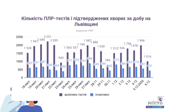 За минулу добу, 5 грудня, у Львові та на Львівщині коронавірусну інфекцію виявили у 451 людини. За оперативними даними, за учорашній день лабораторні центри провели 1016 ПЛР-тестів, з яких 451 виявився позитивний (з них 209 – мешканців Львова).