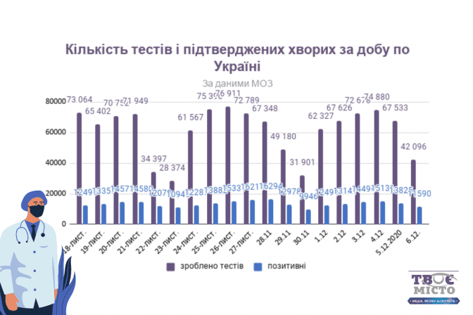 В Україні станом на 6 грудня зафіксували 11 590 нових випадки коронавірусної хвороби Covid-19. З Летальних випадків було 167. Одужали 6 048 українців.