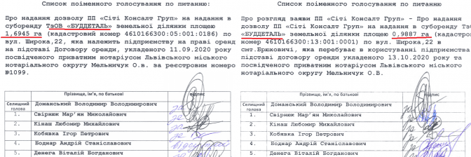 Із судового реєстру ми дізналися, що ділянка на Широкій, 22 площею майже 1 га обліковуватись в межах кварталу №39 Брюховицького лісництва. Аби допомогти «Сіті Консалт Груп» Брюховицька селищна рада позивалась до Львівської державної лісовпорядної експедиції. Суд зобов’язав її привести у відповідність планово-картографічні матеріали, – виключити з меж кварталів Брюховицького лісництва майже 4,6 га, зокрема і згаданий 1 га.