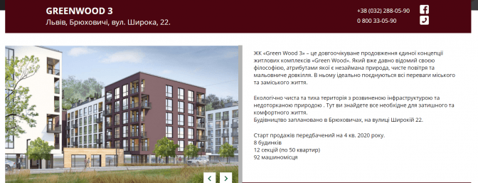 Фактично ділянка на вулиці Широкій, 22 буде продовженням їхнього проекту, бо тут будуватимуть «ЖК Грінвуд 3». Як на вказано на сайті компанії, планують збудувати 8 п’ятиповерхових будинків на 12 секцій, тобто загалом 600 квартир.