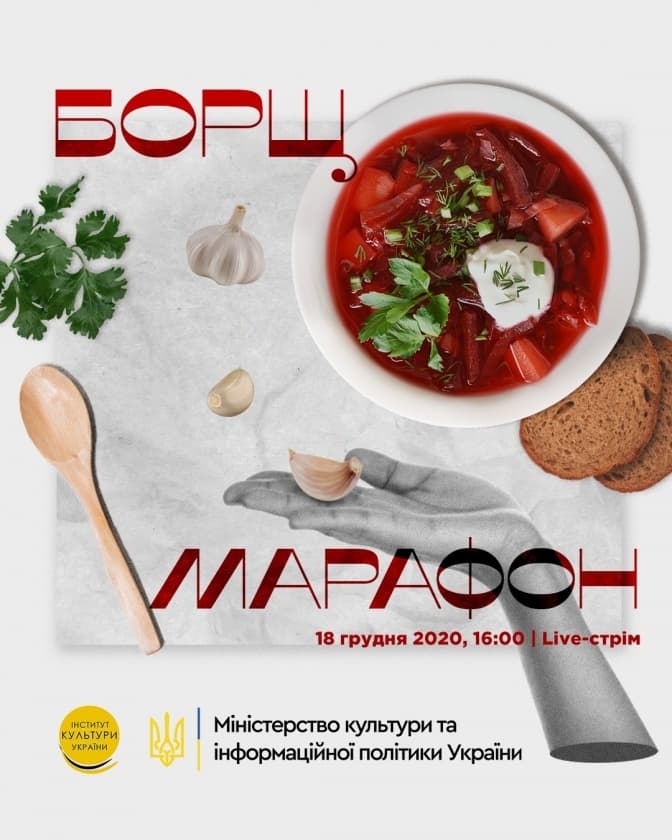 Цієї п’ятниці, 18 грудня, Міністерство культури та інформаційної політики України спільно з відомим кухарем Євгеном Клопотенко та ГО «Український інститут культури» організовують великий онлайн борщ-марафон «Культура та традиція приготування українського борщу». Початок о 16.00 год, повідомляє Міністерство культури та інформаційної політики України.
