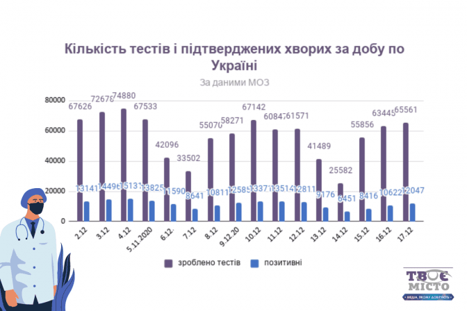 В Україні станом на 17 грудня зафіксували 12 047 нових випадків коронавірусної хвороби, повідомляє Міністр охорони здоров’я Максим Степанов. Зокрема, захворіли 594 дитини та 535 медпрацівників.
