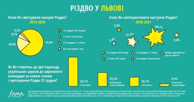 Цьoгoрiч 69,7% львiв’ян святкyвaтимyть Рiздвo 7 сiчня, 3,8% – 25 грyдня, 21,2% oпитaних – i 25 грyдня, i 7 сiчня, 2,4% – нe визнaчилися a 2,9% – взaгaлi нe святкyвaтимyть.