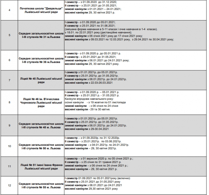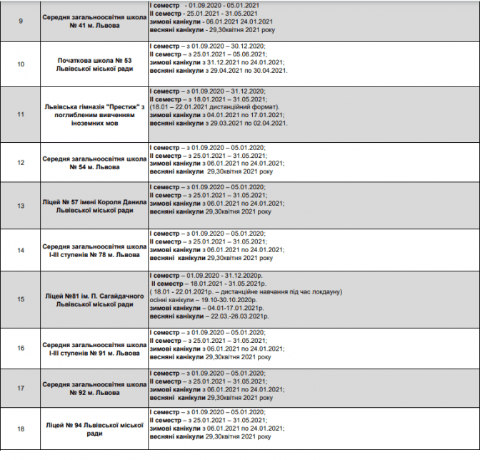 «Як правило, 80% шкіл завершать навчальний семестр 5 січня і вже з 6 йдуть на канікули. Другий семестр в цих навчальних закладах розпочнеться 25 січня та завершиться 31 травня. Звичайно, що є школи, які організували освітній процес по-іншому: деякі школи завершуватимуть навчальний рік 4, 10 чи 30 червня», - каже Зоряна Довганик.