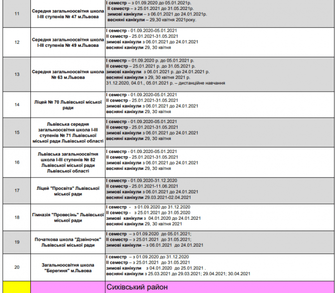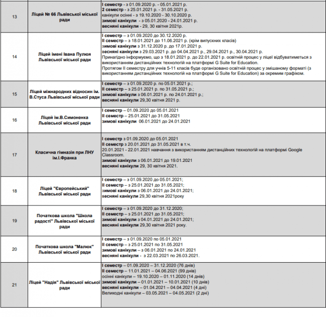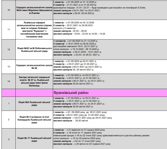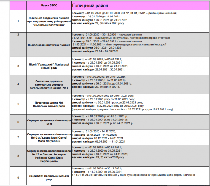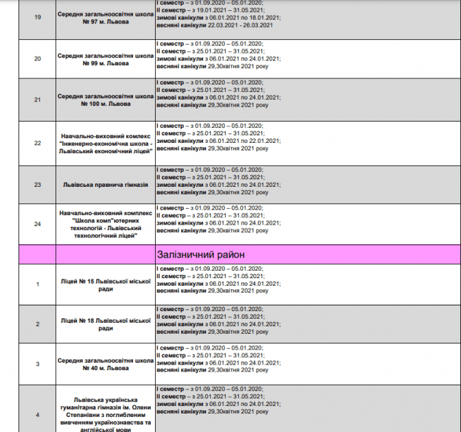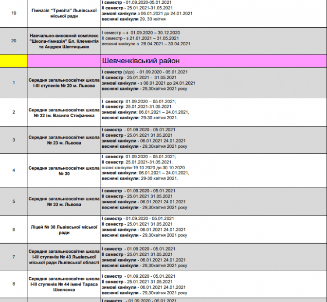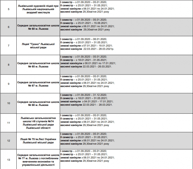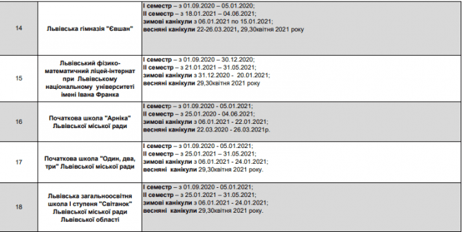 Управління освіти Львівської міськради рекомендує розпочати зимові канікули у школах з 6 січня. Проте, за словами керівниці управління Зоряни Довганик, навчальні заклади формують структуру свого навчального процесу самостійно.