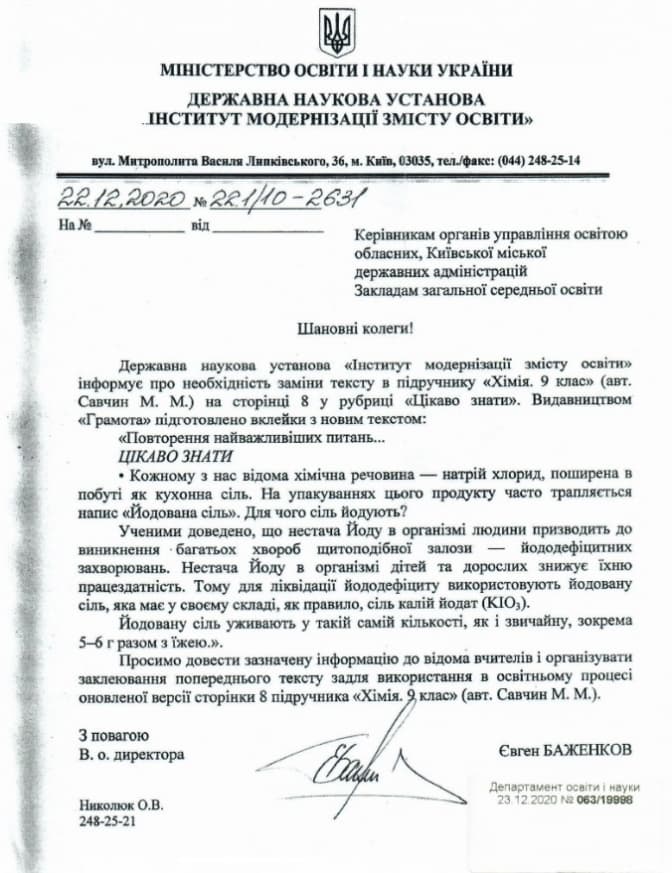 «Просимо донести зазначену інформацію до відома вчителів і організувати заклеювання попереднього тексту задля використання в освітньому процесі оновленої версії сторінки 8 підручника «Хімія. 9 клас», – йдеться у листі.