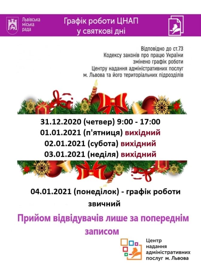 Укрпошта не працюватиме 1 і 7 січня. Із 2 по 5 січня 2021 року оператор працюватиме за звичайним графіком, а 6 січня – за скороченим. Із 8 січня відділення пошти вийдуть на звичний режим.