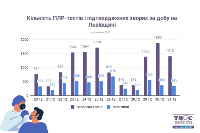 За попередню добу, 30 грудня, в Львівській області провели 1 412 досліджень на коронавірус, з них – 345 позитивних (216 – львів'яни). Про це повідомляє пресслужба Львівської ОДА.