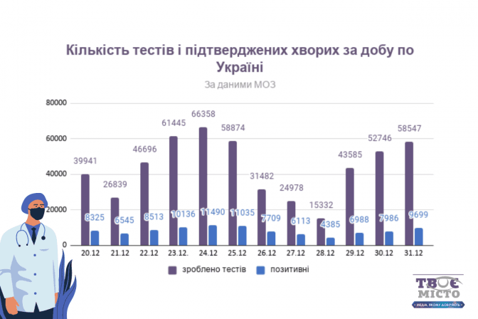 В Україні станом на ранок 31 грудня зафіксували 9 699 нових випадків коронавірусної хвороби. Зокрема, захворіли 341 дитина та 439 медпрацівників. Про це повідомляє міністр охорони здоров'я Максим Степанов.