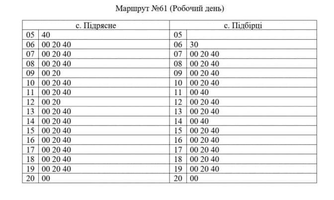Автобус №61 курсуватиме з с.Підрясне через с.Рясне-Руське, Рясне, вул.Шевченка, центральну частину Львова, вул.Личаківську, вул.Тракт Глинянський і до с.Підбірці.