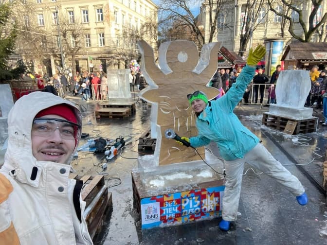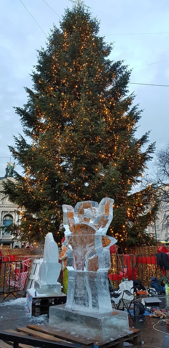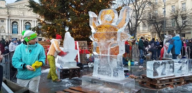 На площі перед Львівською оперою митці створюють льодові скульптури. Вони стоятимуть в центрі Львова, поки дозволятиме погода.