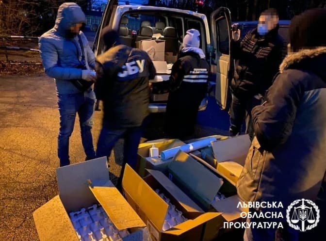 Під час обшуків слідчі виявили та вилучили 2 транспортні засоби, 15 картонних коробок, в яких міститься 500 пляшок з дозатором, які в середині повністю заповнені прозорою речовиною, 2 рулони наліпок для антисептичного засобу у кількості 16 листів із надписами «АХД 2000», 5 пластикових пляшок із спиртовмісною рідиною, 262 стіки дезінфікуючого засобу, 6 мобільних телефонів, 2 ноутбуки та суму у понад 70 тис. грн.
