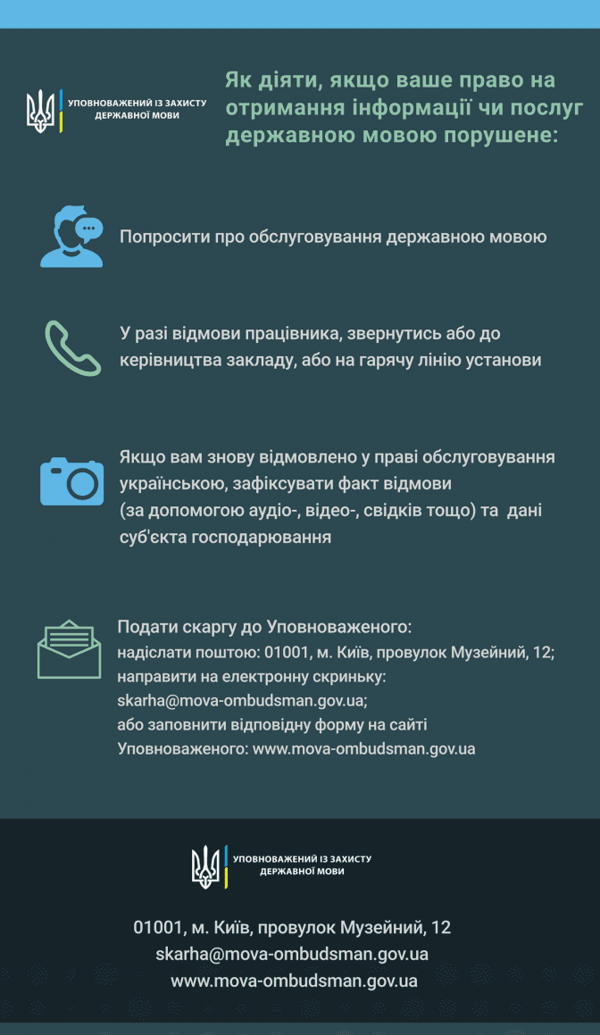 «Надіслати скаргу можна до Уповноваженого на поштову адресу 01001, м. Київ, провулок Музейний, 12, електронну скриньку [email protected] або заповнити відповідну форму на сайті Уповноваженого www.mova-ombudsman.gov.ua», – пише Тарас Кремінь.