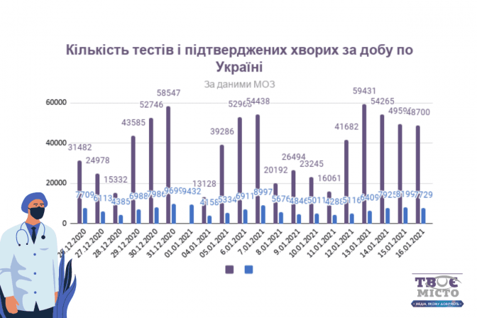В Україні за добу підтвердили 7 729 нових випадків коронавірусної хвороби. У стаціонари госпіталізували 2 083 людей, померли від ускладнень 144 пацієнти, а одужали 9 792 українців. За добу в країні провели 48 700 тестувань.