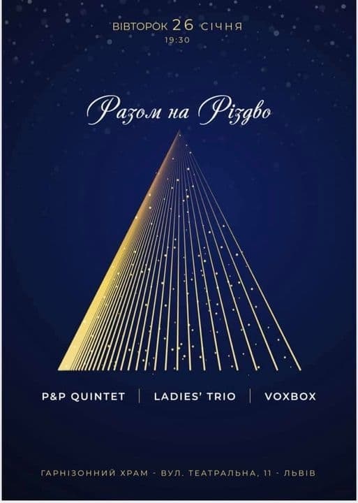 Початок о 19:30 за адресою вул. Театральна, 11. Колядки виконуватимуть гурти P&P Quintet, Ladies` TRIO, VoxBox.