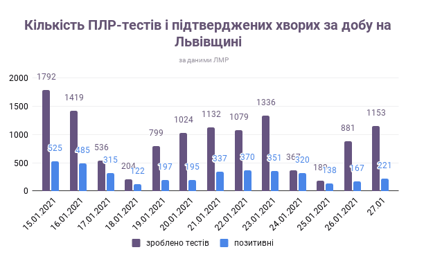 За попередню добу, 26 січня, на Львівщині провели 1 153 дослідження на коронавірус, з яких 221 виявився позитивним. Львів'ян – 105.