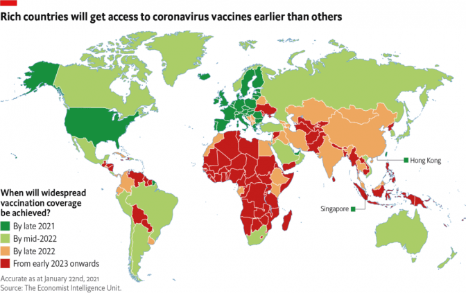 Багаті країни отримають доступ до вакцин проти коронавірусу раніше, ніж інші. Мапа: The Economist
