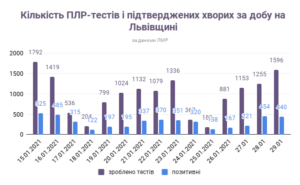 За попередню добу, 28 січня, на Львівщині провели 1 596 досліджень на коронавірус, з них – 440 позитивні.
