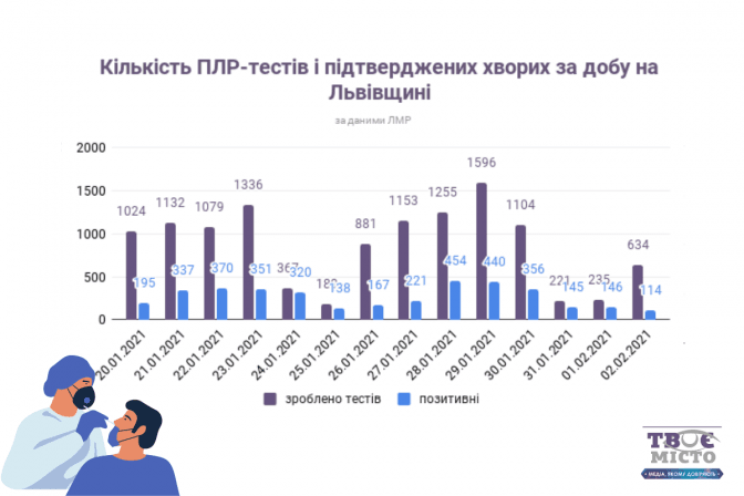 За попередню добу, 1 лютого, на Львівщині провели 634 досліджень на коронавірус, з яких 114 виявилися позитивними.
