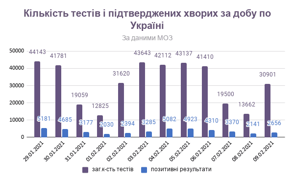 В Україні, за даними Міністра охорони здоров’я України Максима Степанова, станом на 9 лютого, зафіксовано 2 656 нових випадків Covid-19. Зокрема, захворіли 157 дітей та 229 медпрацівників.