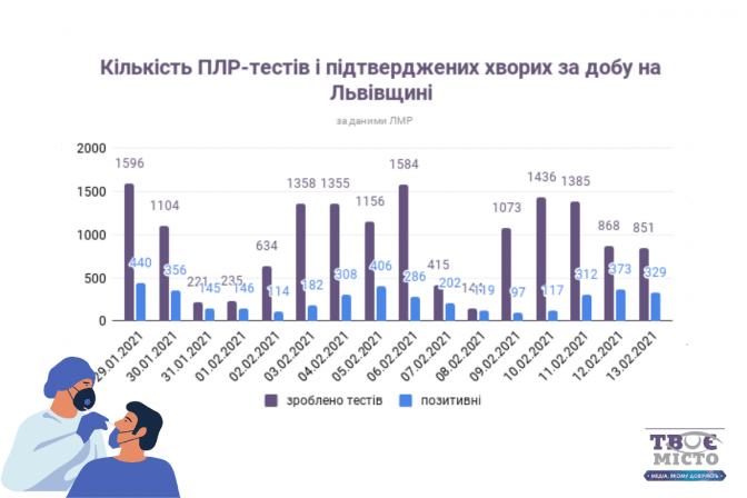 За попередню добу на Львівщині провели 851 дослідження на коронавірусну інфекцію, з них 329 виявилися позитивними.