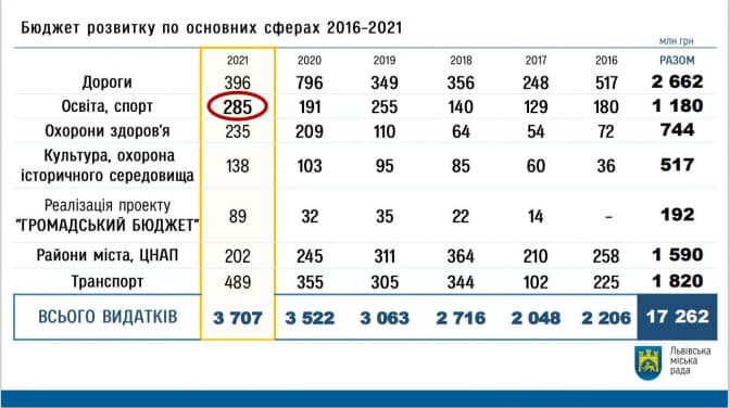 Загальний обсяг бюджету розвитку у 2021 році становитиме 3 мільярди 707 мільйонів гривень. Торік він становив 3 мільярди 522 мільйони. Цього року вперше гроші бюджету розвитку передбачають не лише на Львів, Винники і Брюховичі, а й на решту населених пунктів, які увійшли до складу Львівської ОТГ.